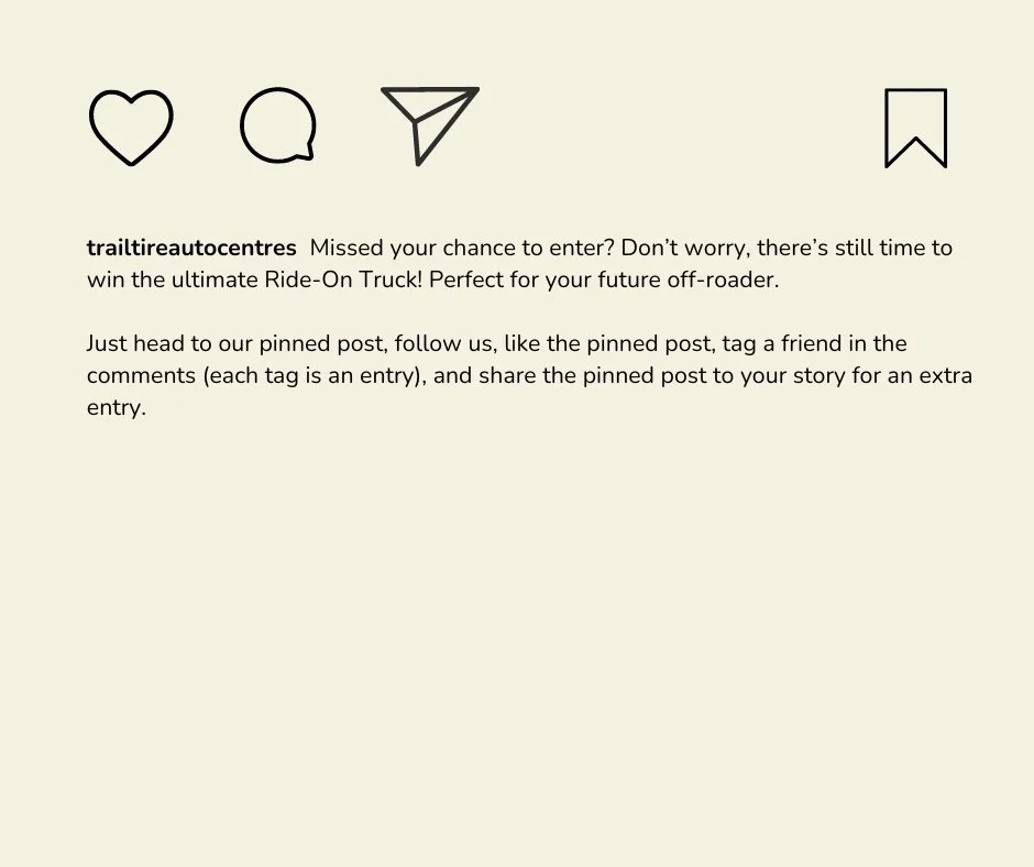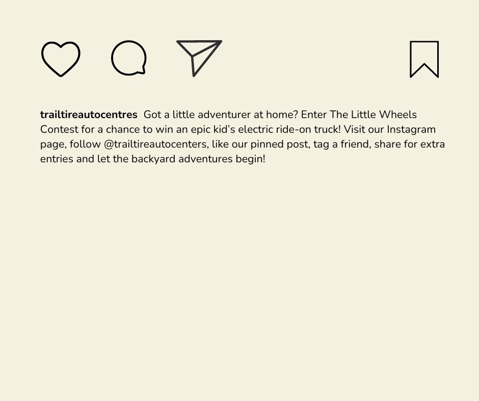 In the "Little Wheels Contest" campaign for Trail Tire, I channelled the spirit of iconic Ford truck commercials, blending humour and drama to captivate both kids and adults. The campaign featured engaging Instagram posts, impactful Twitter graphics, and persuasive landing page copy, all designed to boost participation. I also crafted copy for in-store Trail TVs, ensuring cohesive visual and thematic alignment across all platforms.